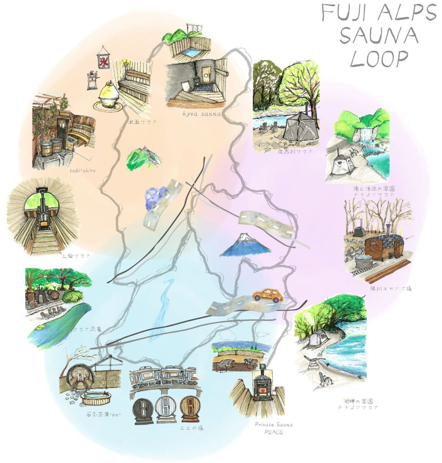 アウトドアサウナの特徴をイラストで描き下ろしました。高速道路を軸として特徴的なサウナを巡る旅はいかがですか?